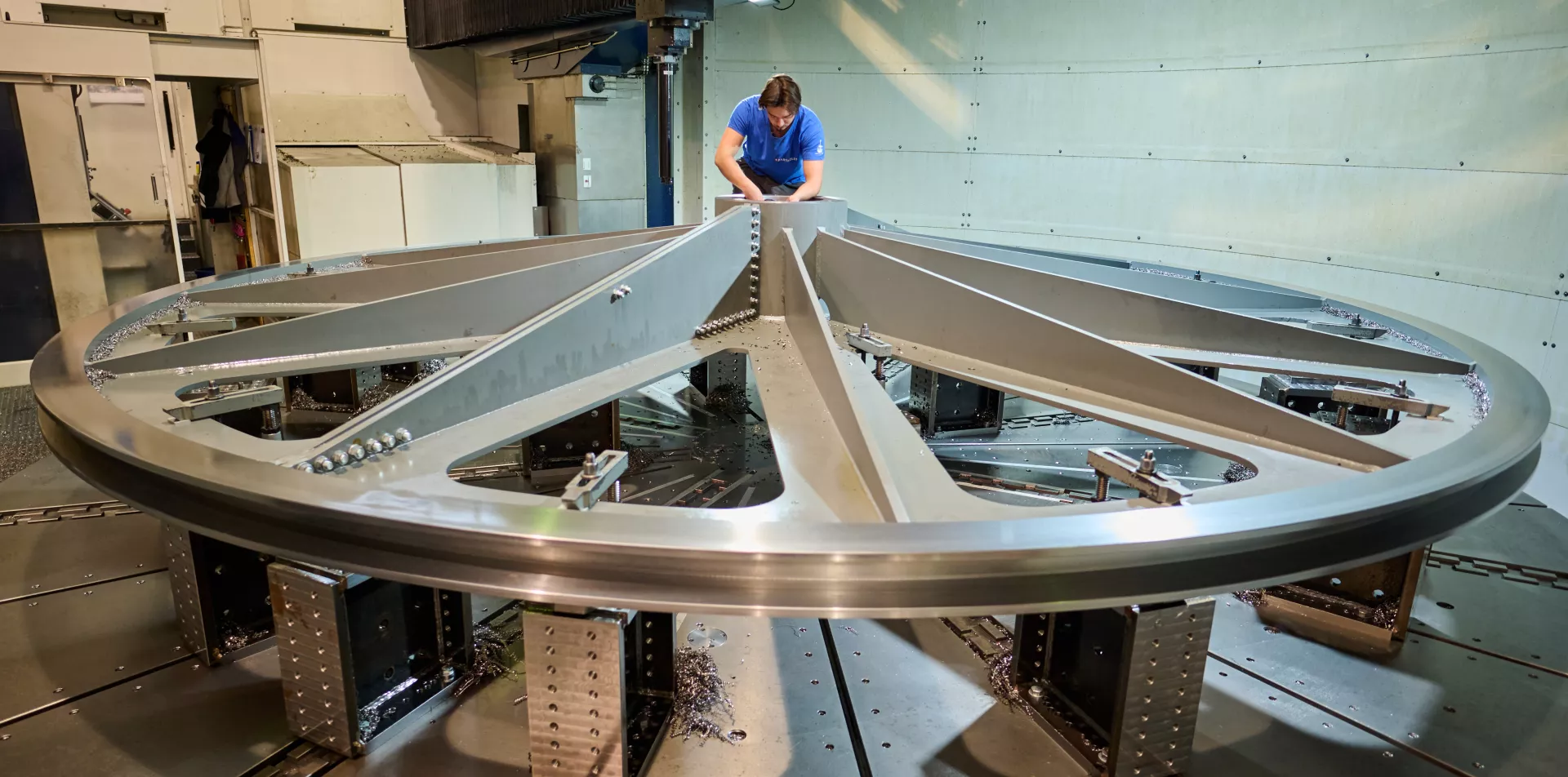 mit bis zu 8m Durchmesser, 3.5m Höhe und 90t Gewicht bearbeitet werden – simultan mit zwei Bearbeitungseinheiten.