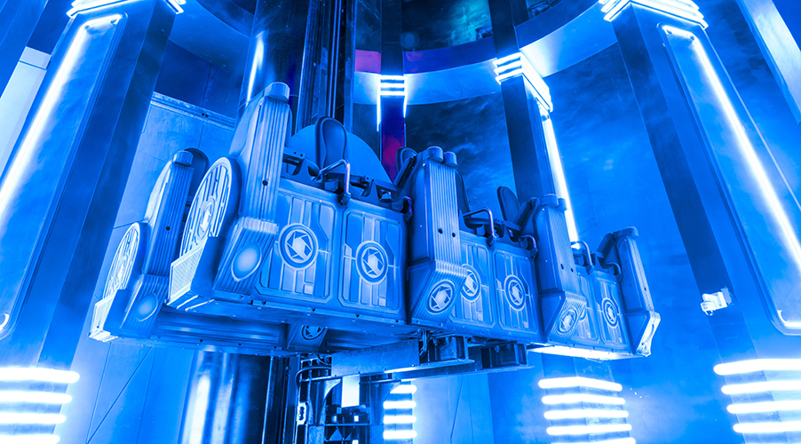 The Bartholet drop tower in Doha has been a popular adventure attraction since 2019. Every year, we work together with Doha Quest to carry out maintenance and ensure the safety of the guests. The tower is moved up and down by two ropes, with the seats inclined forward by 10° and reaching a maximum speed of 7 m/s. The drive system is installed at ground level, and a mechanical tensioning weight provides the required rope tension.