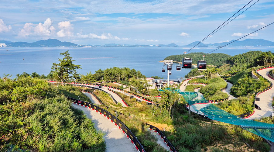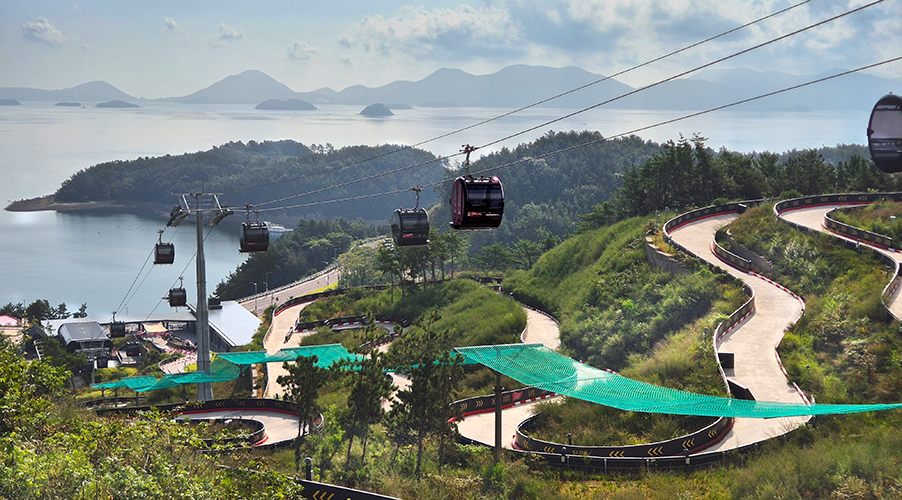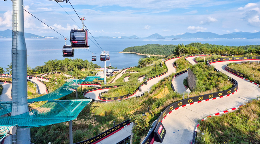 The Challenge Park toboggan run in Yeosu, South Korea, offers a spectacular view of the sea from a height of 86 meters. The gondolas designed by Studio F. A. Porsche can transport up to 2300 passengers per hour.