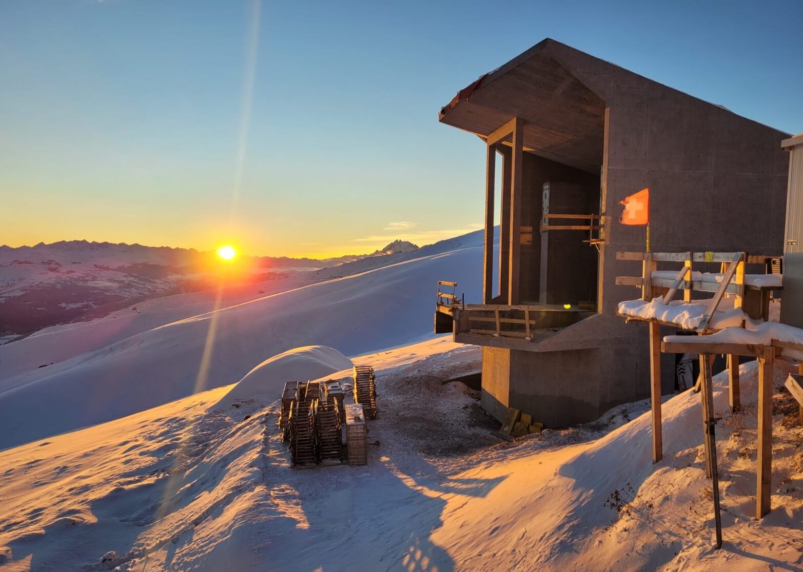 In the Swiss municipality of Flims in the canton of Graubünden, the existing so‑called “milk cableway”, which is around 50 years old, is currently being replaced by a new aerial tramway built by us. The route leads from the district of Fidaz up to Flimserstein, a high plateau north of Flims.