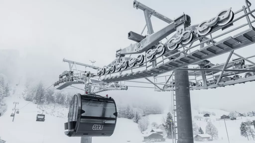 From the 2019/20 winter season, the system will be ready for operation on the Gstaad Eggli. After Narvik (NO), this is Bartholet's second 10-seater gondola lift. The facility is equipped with 20 luxurious gondolas and carries 1,200 passengers per hour. The gondolas are characterised by laminated safety glass and a generous interior design including benches, intercom, WLAN equipment as well as interior and exterior lighting. The battery required for this is installed in the floor of each gondola.
