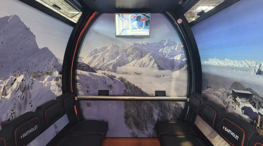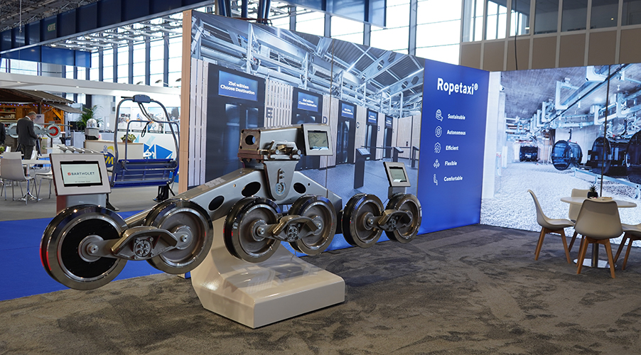 From 16 to 18 April, we presented our latest innovations in Grenoble. We hope our appearance sparked your interest and left a positive impression. One of the highlights at our booth was a 10-passenger gondola featuring ski racks positioned inside the cabin. Its distinctive oval shape provides generous legroom, offering a noticeably enhanced level of comfort. We also showcased our sheave assembly, which stands out thanks to simplified maintenance and a significant reduction in helicopter operating costs. The assembly can be easily unscrewed and quickly removed from or reattached to the helicopter using a quick-release system. This allows the use of smaller helicopters, which are more readily available than larger models. In addition, the sheave assembly is equipped with an automatic lubrication system, ensuring consistently smooth operation of the sheaves. Another highlight was our Ropetaxi grip, equipped with two motors that enable autonomous movement of the gondola along the rails.