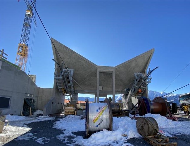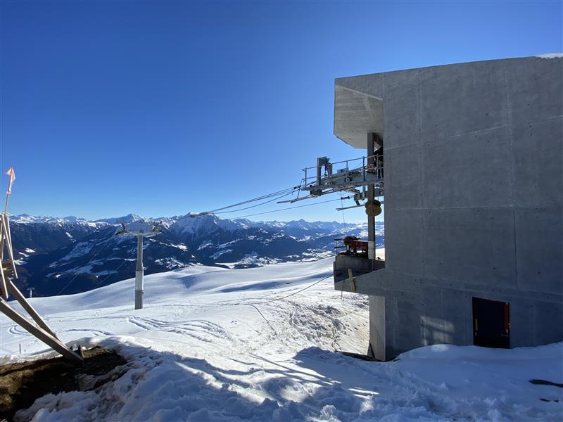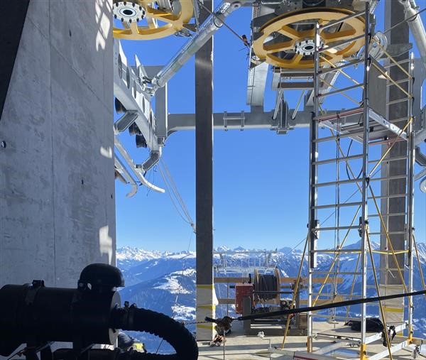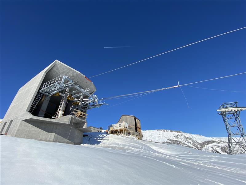Nach einer Woche Stillstand der Seilarbeiten aufgrund sehr schlechter Witterung mit über 1.5 Meter Schnee, haben wir das Traumwetter diese Woche mit weiten Armen empfangen und perfekt genutzt –Auf der Baustelle der Milchbahn Fidaz konnte einen weiteren wichtigen Teil-Meilenstein erreicht werden: