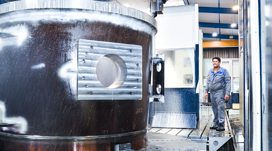 mit bis zu 8 m Durchmesser, 3.5 m Höhe und 90 t Gewicht bearbeitet werden – simultan mit zwei Bearbeitungseinheiten.
