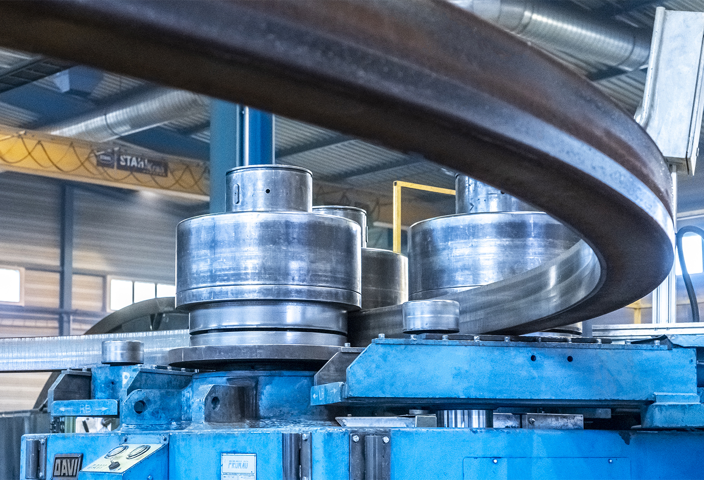 Gewalzt wird bei uns mit einer 3-Walzen-Profilbiegemaschine, welche einen Druck von 220 bar aufbaut und das Biegen von überdimensionalen Profilen ermöglicht. Stahlprofile bis 7 m Länge und Vierkant bis zu 150 mm × 150 mm werden kalt gebogen.